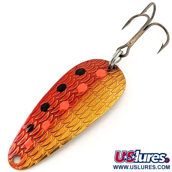Marchiata chiaramente sul retro rifinito in oro, la scritta "THOMAS S515 1/4 OZ CYCLONE" identifica questo classico ondulante americano. Lungo 4,5 cm (1 3/4") e dal peso di 7 g (1/4 oz), l'esca presenta un distintivo motivo a scaglie in rilievo sul lato convesso. Questa superficie texturizzata è rifinita con un vivace gradiente arancio e oro, ulteriormente impreziosito da puntini rossi e neri applicati a mano. Il retro rimane in oro lucido altamente riflettente, garantendo un contrasto ad alta visibilità per lo spinning o la traina. Prodotto negli USA con codice 12881, questo esemplare è in condizioni 5/5 con finitura perfetta. L'amo triplo è collegato tramite un robusto anellino spaccato e la punta è forata per il collegamento diretto o tramite moschettone.