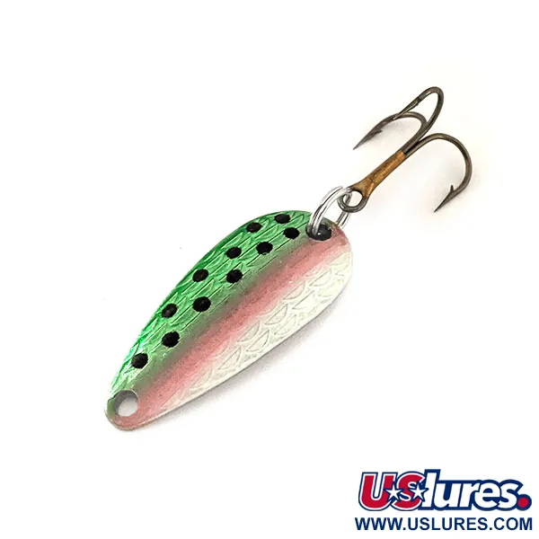 Con un peso di 1/8 oz (4,3 g), la trama a scaglie in rilievo su questo cucchiaino vintage aggiunge una texture unica alla sua base argentata. La finitura Trout è applicata meticolosamente, con una metà superiore verde vibrante con macchie nere che sfumano in una delicata linea laterale rosa al centro. Sul retro lucido, la punzonatura 'THOMAS S514 1/8 oz CYCLONE' è netta e perfettamente leggibile, identificando la specifica linea di modelli di origine statunitense. Con una lunghezza di 3 cm (1 1/4"), il cucchiaino rimane in condizioni eccellenti, valutato 5/5 per la conservazione della finitura e dei componenti originali. L'attrezzatura include un singolo amo ancoretta in bronzo fissato tramite un anello spaccato color argento. Il codice prodotto 13130 identifica questo particolare esemplare, che mette in risalto l'artigianato di Thomas Spinning Lures nei cucchiaini in metallo.