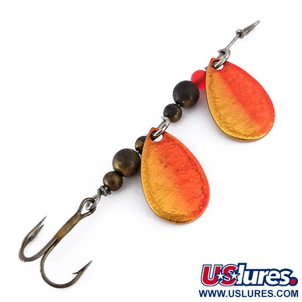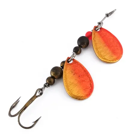 Lungo 7 cm (2 3/4"), questo attrattore a doppia pala mette in mostra il classico artigianato americano tipico di Thomas hardware. Ciascuna delle due palette a goccia è rifinita con una sfumatura Oro / Rosso, in cui una base dorata metallica sfuma in una ricca tonalità rosso-arancio. Capovolgendo le palette si scoprono i marchi autentici del produttore che lo identificano come un THOMAS DOUBLE SPINN, con il peso impresso profondamente nel metallo. L'assemblaggio interno è costituito da perle in ottone scuro di varie dimensioni, integrate da una singola perla rosso vivace posizionata vicino alla parte superiore del telaio metallico. Un amo triplo con finitura scura è fissato nella parte posteriore, in linea con l'estetica utilitaristica di questo artificiale vintage prodotto negli USA. Valutato 5/5, questo esemplare da 5 g (3/16 oz), catalogato con il codice 10133, presenta superfici eccezionalmente pulite sia sulle parti verniciate che su quelle stampate.
