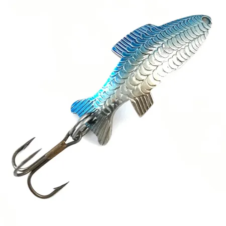 Stampato con il nome "THOMAS" e la designazione "T109" sulla parte inferiore lucida, questo ondulante mette in mostra la maestria artigianale delle attrezzature da pesca prodotte negli Stati Uniti. Con un peso di 7 g (1/4 oz), il corpo in metallo presenta una trama a scaglie profondamente goffrata che aggiunge consistenza e interesse visivo alla finitura Nickel / Blu. La metà superiore è rivestita di un blu metallizzato brillante che sfuma nel ventre in nichel pulito, imitando efficacemente il mimetismo naturale dei piccoli pesci foraggio. Lungo 4 cm (1 1/2"), l'artificiale è armato con un robusto amo triplo fissato tramite un solido anellino spaccato sulla coda, mentre la testa presenta un foro per il fissaggio della lenza. Valutato 5/5, le condizioni di questo esemplare sono eccellenti, con la scritta "FIGHTING FISH" e i timbri del peso che rimangono nitidi e ben definiti. Questo specifico articolo, identificato dal codice prodotto 5326, è un classico esempio di esca da lancio durevole utilizzata da generazioni di pescatori per insidiare trote e persici sole.