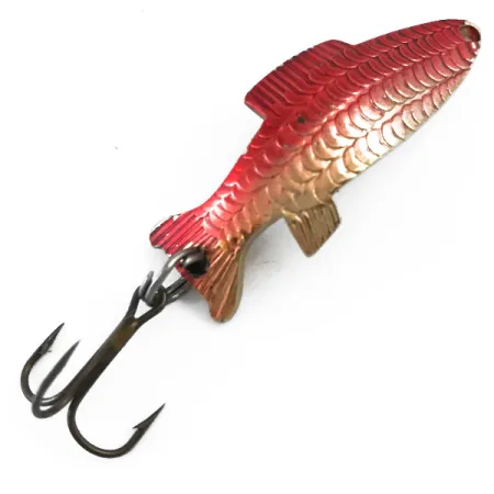 Tonalità oro e rosso si fondono sulla trama a scaglie in rilievo del corpo da 4 cm. Questo Thomas Fighting Fish, identificato dal codice prodotto 5328, presenta un particolare profilo a forma di pesce con pinne dorsali e pettorali stampate direttamente nel metallo. Il peso di 7 g fornisce la densità necessaria per lanci efficaci nelle zone mirate. Sul retro, la superficie in oro lucidato è chiaramente marcata con il nome del produttore, il nome del modello e la dicitura T109. Un amo triplo con finitura bronzata è collegato alla coda tramite un anellino spaccato, mantenendo l'assetto classico di questo artificiale prodotto negli USA. Valutato 5/5, lo stato dell'esemplare è eccellente, con una finitura brillante e testi stampati perfettamente leggibili.