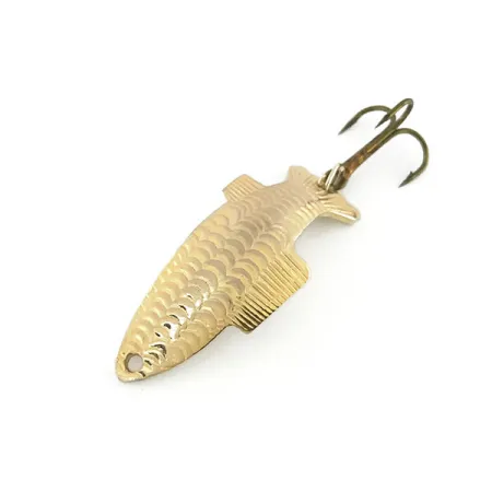 Squame a rilievo coprono il lato convesso di questo ondulante da 4 cm (1 1/2"), fornendo una consistenza realistica che esalta i riflessi di luce durante il recupero. Con un peso di 7 g (1/4 oz), questo Thomas Fighting fish color oro, catalogato con il codice prodotto 8619, è un classico esempio dell'artigianato americano degli artificiali. Il lato posteriore rimane liscio e riporta il marchio profondo 'FIGHTING FISH', identificando chiaramente il modello sulla finitura dorata lucida. Questa specifica esca mantiene una valutazione di condizione 5/5, con la placcatura e le minutaglie che rimangono notevolmente brillanti e funzionali. Il suo profilo include un design a pinna svasata vicino alla coda, che conduce all'ancoretta originale di fabbrica. L'artificiale proviene dagli USA, rispecchiando gli standard di produzione durevoli tipici della minuteria vintage Thomas.