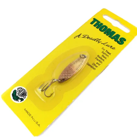 Una placcatura in rame ricopre il corpo squamato di questo classico ondulante, fornendo una superficie ad alta rifrazione progettata per attirare l'attenzione di trote e salmoni. Con un peso di 1/4oz (7g), il Thomas Rough Rider presenta una distintiva finitura testurizzata che imita le scaglie naturali dei pesci esca. Questo esemplare, identificato dal codice prodotto 9997, misura 3,7 cm (1 1/2") di lunghezza e si conserva nella sua confezione originale di fabbrica con fondo giallo. Il marchio sulla faccia metallica riporta chiaramente il nome del modello "ROUGH RIDER", a testimonianza della qualità della produzione americana. Questa esca è inutilizzata e si trova nelle condizioni originali di acquisto, con una valutazione di stato pari a 6. Un amo triplo con finitura bronzata è fissato saldamente, adatto al lancio in torrente o alla traina nei laghi alpini. La confezione d'epoca ne indica l'efficacia per sandra e pesci foraggio, mettendo in luce la versatilità che mantiene le esche Thomas nelle cassette dei pescatori da decenni.