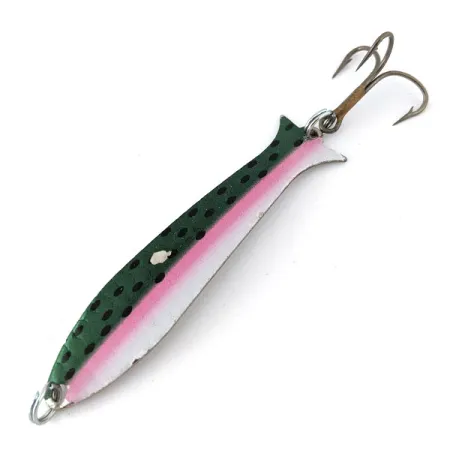Il corpo in metallo stampato da 6,5 cm (2 1/2") di questa esca è rifinito con una dettagliata livrea Rainbow Trout su una base argento lucido. Progettato principalmente per la traina, questo Thomas Speedy Shiner (codice prodotto 14383) ha un peso di 5 g (3/16 oz) e mantiene un profilo sottile che imita perfettamente il pesce foraggio. La verniciatura frontale presenta un dorso verde scuro con puntini neri, una marcata striscia laterale rosa e una parte inferiore bianca. Capovolgendo l'esca si notano i marchi di fabbrica del produttore e la specifica del peso chiaramente incisi nel metallo argentato, insieme a un logo a forma di aquila. Questo esemplare è in condizioni eccellenti (5/5), con vernice e componentistica ben conservate. Viene fornito con anellini originali e un'ancoretta affilata, rispecchiando gli standard qualitativi delle esche Thomas prodotte negli USA, ideali per la pesca di trote e salmonidi.