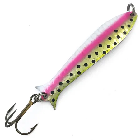 Punzonato sul retro con il logo classico e l'indicazione del peso, questo ondulante da 6,5 cm (2 1/2") mette in mostra la durevole nichelatura sinonimo della produzione americana di Thomas. La finitura Trout / Nickel è particolarmente accattivante, combinando una vivace linea laterale rosa neon con riflessi di scaglie verde-oro e una serie di punti neri profondi. Con un peso di 5 g (3/16 oz), l'esca è progettata appositamente per la traina, utilizzando un profilo sottile e allungato per massimizzare la visibilità in varie condizioni di luce. Questo specifico esemplare, identificato dal codice prodotto 5040, è in condizioni 5/5, con vernice e componentistica eccezionalmente ben conservate. È armato con due robusti anellini e un'ancoretta affilata in coda, sottolineando la costruzione di qualità che ci si aspetta da un'esca vintage prodotta negli Stati Uniti.