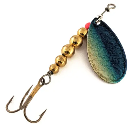 La paletta martellata mostra una sfumatura che va dal blu profondo all'oro lucente, creando un forte contrasto con il retro in nichel lucidato. Sulla parte inferiore di questo esemplare da 3/16 oz (5 g) sono impressi chiaramente i marchi originali del produttore e l'origine USA, segno di qualità del modello Thomas Spinn. Con una lunghezza totale di 7 cm (2 3/4"), il corpo dell'esca è assemblato con cinque perline dorate graduate e una piccola perlina rossa posizionata appena sopra il cavallotto della paletta. Questo esemplare, identificato dal codice 12816, è in condizioni eccezionali (voto 5/5). La componentistica consiste in un classico asse in filo metallico e un'ancorina affilata, mantenendo l'integrità strutturale di un pezzo vintage ben conservato.