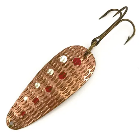 Lunga 5 cm (2"), questa ondulante presenta una finitura in rame martellato profondamente testurizzata, impreziosita da una serie di punti rossi e bianco-argento. Con un peso di 10 g (1/3 oz), l'esca riporta sul retro la dicitura stampata "THOMAS S516 1/3 OZ CYCLONE", che riflette la tradizione americana di questo produttore. L'esemplare, identificato dal codice prodotto 7342, è in condizioni 5/5, apparendo eccezionalmente pulito e ben conservato. Collegata tramite un anellino spaccato, l'ancoretta in bronzo rimane affilata e strutturalmente solida. Un piccolo foro per il legame della lenza è praticato con precisione sulla testa stretta, completando il profilo classico della minuteria.