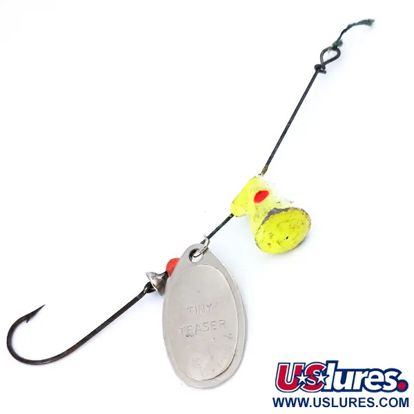 Chiaramente impresso nella paletta ovale in nichel, il nome identifica questo modello Royal Canadian come un pezzo classico della storia dell'attrezzatura Spin-Erie. Con una lunghezza totale di 10 cm (4") e un peso di 17 g (3/5 oz), l'esca utilizza un robusto telaio in metallo progettato per le specie d'acqua dolce canadesi. L'artificiale presenta una testa dipinta di giallo brillante con punti rossi, seguita da una perla rossa coordinata e una paletta rotante tonalità argento lucido. Valutato 5/5 per le condizioni, l'esemplare mostra una conservazione straordinaria con superfici metalliche brillanti e vernice nitida sul corpo zavorrato. Un grande amo singolo è integrato nell'assemblaggio inferiore, mentre il filo superiore è rifinito con un occhiello intrecciato per la lenza. I collezionisti troveranno il codice prodotto 10348 associato a questa specifica combinazione di colori nichel e giallo.