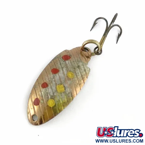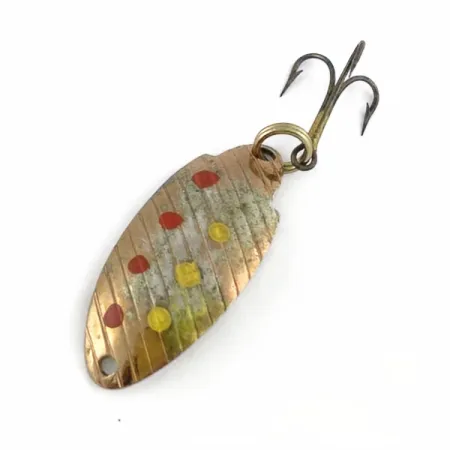 Una trama a costine diagonali caratterizza la superficie di questo ondulante color rame, creando una base testurizzata per i suoi puntini rossi e gialli applicati a mano. Lungo 4 cm (1 1/2") e dal peso di 5 g (3/16 oz), questo Tommen Dolly è stato fabbricato negli USA e identificato dal codice prodotto 23684. L'artificiale è equipaggiato con un'ancoretta fissata tramite un anello spaccato, mentre un singolo foro di attacco è situato sulla punta affusolata. In condizioni 4/5, il metallo e la vernice mostrano una patina invecchiata che ne conferma il carattere vintage. Un semplice anello spaccato collega l'hardware posteriore al corpo in metallo stampato.