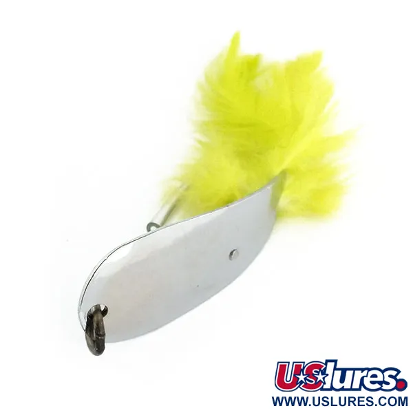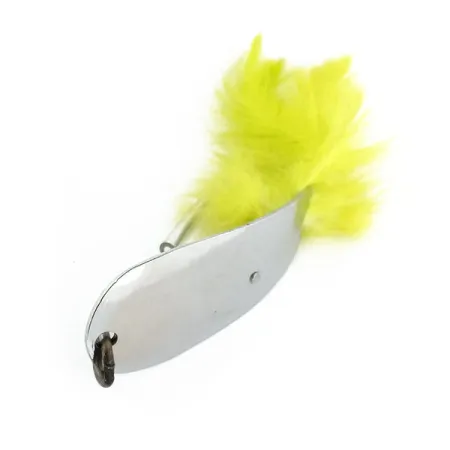 La nichelatura conferisce una finitura a specchio a questo ondulante di produzione americana, un design essenziale per riflettere la luce in varie condizioni d'acqua. Con un peso di 12 g (2/5 oz) e una lunghezza di 5,5 cm (2 1/4"), questo Tony Accetta HOBO, identificato dal codice 13200, rappresenta un pezzo classico delle cassette da pesca di metà secolo. Il lato concavo del corpo dell'esca è stampigliato con il marchio del produttore e la dicitura "Genoa, O.", a testimonianza della sua origine negli Stati Uniti. Un amo singolo è integrato nel design, ornato da vivaci piume di hackle gialle che creano un netto contrasto con il metallo lucido. Per agevolare il passaggio tra la vegetazione durante il lancio, un sottile dispositivo antialga in filo metallico è posizionato sopra la punta dell'amo. L'esemplare è in condizioni 5/5, mantenendo una brillante lucentezza sulle superfici nichelate e sui componenti originali.