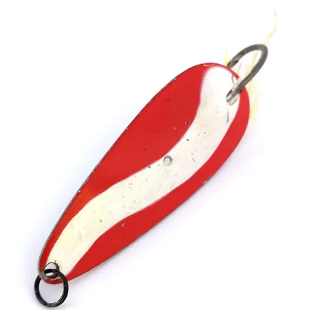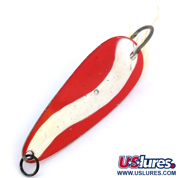 Un motivo a smalto rosso/bianco a forma di onda copre il lato convesso di questo ondulante nichelato, un design sinonimo della pesca americana di metà secolo. Identificato con il codice 10607, questo Tony Accetta Weed Doger pesa 1/3oz (10g) e misura 2 1/4" (5,5cm). Il lato concavo rivela un marchio "TONY ACCETTA" stampato in modo netto e un amo singolo dotato di un trailer in piuma gialla fissato con filo rosso. Per agevolare la pesca in fitta vegetazione, l'armatura incorpora un dispositivo antialga a filo. In condizioni 4/5, l'ondulante mostra lievi segni di manipolazione che raccontano la sua storia, mentre il metallo rimane lucido e la vernice vivida. Un semplice anello spaccato nero è fissato all'occhiello anteriore per il collegamento della lenza.