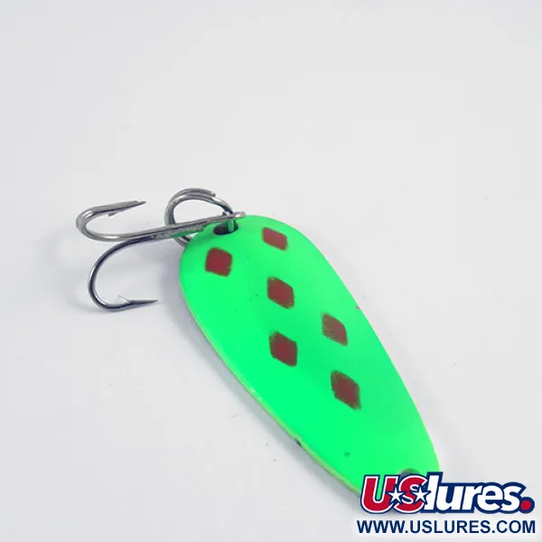 Una vivace vernice chartreuse ricopre il lato convesso di questo ondulante da 5 cm (2"), accentuato da sei distinti rombi rossi che creano un forte contrasto. Identificato dal codice prodotto 2812, questo Blue Fox Tor-P-Do prodotto negli USA è costruito su un corpo in metallo pesante da 14g (1/2oz), rendendolo una scelta ideale per raggiungere le zone di stazionamento più profonde. Il lato posteriore presenta una finitura in nichel lucidato dove il marchio del produttore e il nome del modello Tor-P-Do sono chiaramente stampati nel metallo. Un'ancoretta standard è collegata tramite un anello spaccato in coda, e le condizioni generali sono 5/5, con una finitura ben mantenuta e grafiche nitide. La parte superiore dell'esca include un foro preforato per l'attacco diretto della lenza o un anello spaccato aggiuntivo a seconda delle preferenze di montaggio.