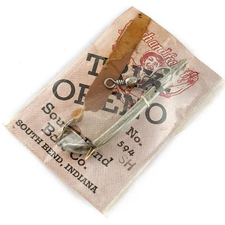 Con una lunghezza di 4,5 cm (1 3/4"), questo specifico esemplare rappresenta la variante per canna da mosca No. 594 del classico South Bend Trix-Oreno. Custodito nella sua bustina originale in carta glassine con grafiche rosse di South Bend, Indiana, il corpo in metallo argentato è rimasto inutilizzato e offre uno sguardo sull'innovazione delle attrezzature da pesca degli anni '40. Questa esca da 2 g (1/16 oz), catalogata con il codice prodotto 17393, è dotata di un'appendice in gomma tipo "pork rind" progettata per attirare i pesci dalle buche più profonde e scure durante le afose giornate estive. L'ingegneria South Bend permetteva a questo modello di sfarfallare come un insetto vivo durante la discesa, mentre un semplice movimento della canna lo fa scartare e affondare come un pesciolino in nuoto. La componentistica include una girella delicata e un amo della misura 1, scelti appositamente per ridurre lo sforzo sulla canna da mosca rispetto ai cucchiaini rotanti standard. Sul retro della confezione, South Bend descriveva i tre stili distinti disponibili per la misura da mosca, notando che il modello 594 veniva intenzionalmente fornito con l'appendice in gomma anziché con una piastrina metallica.