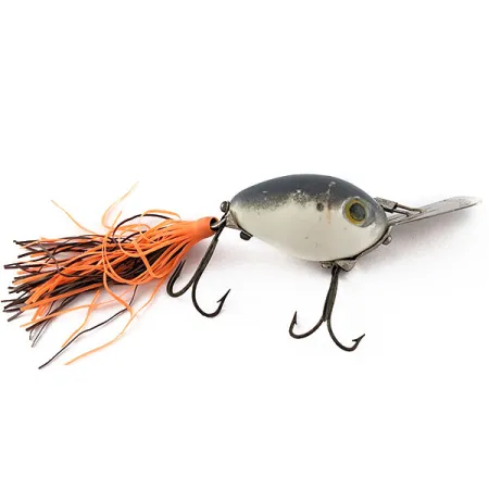 Con un peso di 1/2 oz (14 g), questo esemplare presenta una vistosa paletta affondante in metallo fissata saldamente con due viti alla parte inferiore del muso. Lungo 5 cm (2"), il Fred Arbogast Arbo-Gaster, identificato dal codice prodotto 20571, sfoggia una classica livrea ad alto contrasto con ventre bianco lucido e dorso grigio fumo scuro. Grandi occhi gialli con pupille nere marcate fungono da punto focale sulla testa, tratto distintivo della maestria artigianale d'epoca Arbogast di Akron, Ohio. Una caratteristica rilevante è il gonnellino in gomma arancione e nero fissato all'ancoretta posteriore, progettato per aumentare il profilo visivo dell'esca in acqua. La componentistica comprende due ancorette montate ventralmente che mostrano minimi segni del tempo. In ottime condizioni di conservazione (4/5), l'esca presenta una leggera e autentica usura sulla vernice e sulla paletta metallica, che ne testimonia la storia senza compromettere l'integrità del design. La paletta metallica è progettata per il lancio e permette all'esca di raggiungere le profondità desiderate durante il recupero dalla barca o dalla riva.