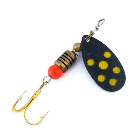Cinque punti gialli ad alto contrasto sono accuratamente dipinti sulla finitura nera della pala ovale, identificando questo Mepps Comet 2 come un classico della fine degli anni '60. Questo cucchiaino rotante da 1/8 oz (4 g) misura 5 cm (2") di lunghezza e utilizza componenti prodotti in Francia assemblati negli USA. Una perla rosso-arancio brillante risalta alla base del corpo in ottone rigato, appena sopra l'ancoretta con finitura dorata, fungendo da punto focale. Catalogata con il codice prodotto 10734, l'esca è valutata in condizioni 5/5 con vernice chiara e vivace e una finitura pulita su tutta la minuteria. Il retro della pala mantiene un rivestimento nero solido, contrastando con i toni caldi dei distanziali e delle perle in ottone che formano l'anima zavorrata dell'esca.