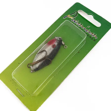 Con un peso di 11 g (2/5 oz), questo artificiale tipo pilker per il jigging è uno strumento compatto da 4,5 cm (1 3/4") per presentazioni verticali. Il Wahoo Key Largo Swim'n Fin, identificato dal codice prodotto 16730, presenta una classica finitura argento e nera, completata da una testa rossa vivace e dettagli dell'occhio. Si tratta di un componente specialistico prodotto nella Repubblica Dominicana con materiali di alta qualità provenienti dagli USA, progettato specificamente per la pesca al lucioperca e al luccio. All'interno del corpo si trova una camera rattle per produrre segnali acustici durante l'azione di jigging. Questo esemplare non è mai stato utilizzato e si presenta nella sua confezione originale in blister verde "Premium Tackle". L'unica ancoretta collegata tramite split ring mostra lievi segni del tempo sulle superfici metalliche, mentre il corpo dell'esca conserva la verniciatura originale di fabbrica.