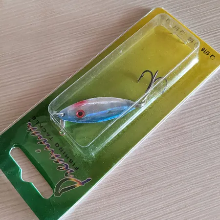 Con un peso di 7 g (1/4 oz), questa esca presenta un'accattivante sfumatura dal blu all'argento con un dettaglio rosso intorno all'occhio. Con una lunghezza di 4,5 cm (1 3/4"), il Wahoo Key Largo Swim'n Fin (codice prodotto 16498) è frutto di un assemblaggio artigianale nella Repubblica Dominicana con componenti prodotti negli Stati Uniti. Questo specifico modello rattling è conservato nella sua confezione originale verde e oro "Premier Fishing Tackle", trattandosi di un esemplare mai utilizzato. Il corpo traslucido rivela una lamina riflettente interna che imita le squame, completata da un'ancoretta affilata e un robusto punto di attacco sul muso. Prodotta dalla Wahoo Fishing Products di North Fort Myers, in Florida, l'esca vanta la finitura ultra-resistente tipica del marchio e componenti di alta qualità progettati per garantire ferrate affidabili. L'occhio rosso offre un punto di mira ad alto contrasto sul profilo idrodinamico e sinuoso del corpo.