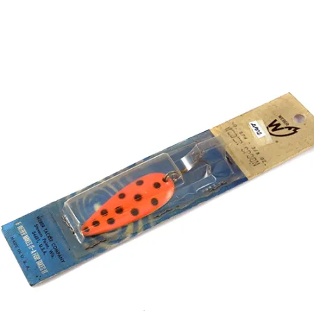 Un vivace motivo a pois rosso/nero identifica immediatamente questo Weber Spoon come un classico della metà del secolo della Weber Tackle Company di Stevens Point, Wisconsin. Con un peso di 11 g (2/5 oz) e una lunghezza di 6 cm (2 1/4"), questo cimelio americano è catalogato con il codice 2802. L'artificiale è in condizioni inutilizzate, fissato nella sua confezione originale blu e beige che riporta lo slogan "Weber Makes It—A Fish Takes It". Sebbene le parti metalliche e la finitura siano pulite, la confezione d'epoca mostra leggeri segni di conservazione coerenti con la sua età. La sua semplice geometria a goccia e l'ancoretta montata posteriormente sono state progettate per la versatilità sia nel lancio che nella traina. Questo esemplare fuori produzione funge da legame tangibile con l'eredità di uno dei più noti produttori di attrezzatura degli Stati Uniti.