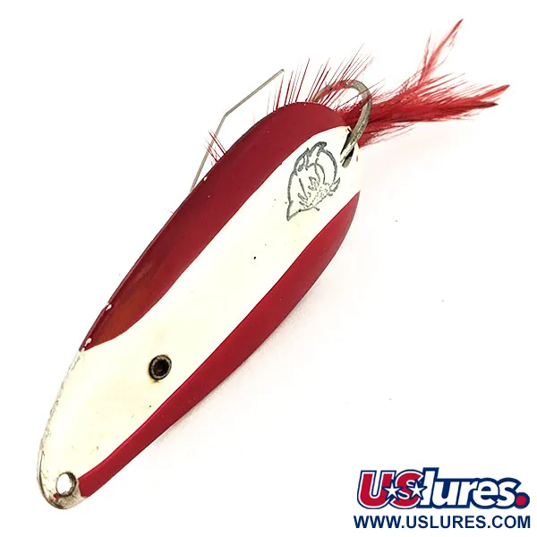 Vivaci strisce rosse e bianche sulla superficie convessa definiscono questo ondulante da 21g (3/4oz) della leggendaria linea Eppinger. Lungo esattamente 7cm (2 3/4"), questo Weedless Dardevle Dardevlet, codice 12702, riporta la classica grafica della testa di diavolo stampata direttamente sulla vernice bianca. Eppinger produce questi artificiali nel Michigan dal 1906, e la struttura in metallo pesante di questo esemplare con retro in nichel testimonia i loro standard produttivi. Questa versione è costruita specificamente per il cover fitto, dotata di un doppio filo antialga che protegge l'amo singolo dagli incagli nella vegetazione. Una coda di piume cremisi è saldamente legata al gambo dell'amo, fornendo una consistenza morbida contro l'interno in nichel lucido. Nelle attuali condizioni 5/5, la vernice rimane nitida e le superfici metalliche mantengono la loro lucentezza. Il foro di montaggio originale all'estremità stretta è pronto per un anello spaccato, posizionato per mantenere l'esca stabile durante un recupero lento tra ninfee o legnaie.