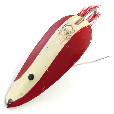 Le strisce smaltate rosse e bianche sono il segno distintivo di questo ondulante da 7 cm (2 3/4"), un design che ha definito le cassette degli attrezzi dei pescatori esperti per decenni. Questo specifico esemplare è una variante weedless (antialga), dotata di un amo singolo protetto da una guardia metallica e adornato con un ciuffo di piume rosse per aiutarlo a scivolare attraverso la fitta vegetazione acquatica. Prodotto da Eppinger, l'azienda del Michigan fondata da Lou Eppinger nel 1906, l'esca reca il classico logo della testa di diavolo stampigliato direttamente sulla striscia bianca del lato convesso. Il lato opposto mostra una finitura in nichel lucidato dove sono chiaramente visibili il marchio del produttore e il peso di 19 g (2/3 oz). In termini di conservazione, l'esca ha un punteggio di 4/5, mostrando lievi saltature della vernice e piccoli segni superficiali che riflettono la sua storia senza compromettere l'integrità strutturale. Identificato dal codice prodotto 5407, questo Dardevlet esemplifica l'attrezzatura di alta qualità prodotta negli USA, così affidabile da essere un tempo inclusa nei kit di sopravvivenza dell'aviazione militare. Lanciare questo ondulante piombato in coperture spesse o tra le ninfee rimane una tecnica preferita per chi insidia lucci o persici trota.
