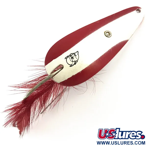 Un piumaggio rosso vivace adorna l'amo singolo di questo ondulante Eppinger vintage da 5,5 cm, progettato specificamente per la pesca in zone ricche di ostacoli. Questo Weedless Dardevle Imp (codice 4262) presenta la classica smaltatura a strisce bianche e rosse sulla faccia convessa, completa del celebre logo con la testa di diavolo. Il retro è nichelato lucido e punzonato con la scritta "DARDEVLE U.S.A.", simbolo della tradizione manifatturiera di Dearborn, Michigan, iniziata nell'officina di Lou Eppinger a Detroit. Con un peso di 11 g, l'esca è dotata di un ferretto antialga in tensione che protegge la punta dell'amo dagli incagli. L'esemplare è in condizioni 5/5, con finitura metallica pulita e linee di vernice nette. La forma concava è ottenuta tramite stampi proprietari del produttore. Le piume rosse rimangono flessibili e ben fissate al gambo dell'amo, conferendo un profilo morbido all'estremità del corpo metallico.