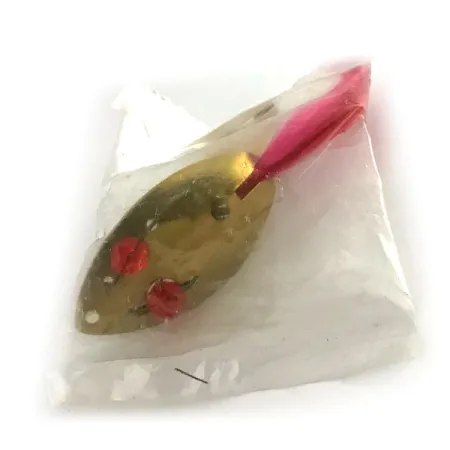 Lungo 4,5 cm (1 3/4"), il Weedless Herter's modello 9232 presenta un corpo placcato oro lucido impreziosito da due perline rosse traslucide. Queste perline sono fissate direttamente attraverso l'ondulante con un telaio in metallo, una scelta di design classica di quest'epoca della produzione giapponese. Con un peso di 6 g (3/16 oz), l'esca utilizza un amo singolo protetto da una guardia antialga in filo metallico per consentire il lancio in una fitta vegetazione. Una vivace coda in piuma rosa è fissata all'amo, fornendo un contrappunto visivo alla finitura dorata metallica. Questo articolo è nuovo, mai usato, mantenendo le superfici incontaminate e i colori brillanti della sua produzione originale. L'occhiello di attacco è punzonato in modo netto all'estremità affusolata dell'ondulante, opposta all'amo piumato.