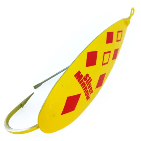 Vivaci rombi rossi risaltano su uno sfondo giallo brillante su questo classico ondulante con motivo "Five of Diamonds". Con una lunghezza di 9 cm (3 1/2") e un peso di 28 g (1 oz), questo modello dal profilo grande è un esempio funzionale della filosofia costruttiva originale di Louis Johnson del 1920. Prodotto negli Stati Uniti, l'ondulante è realizzato in una specifica lega di rame e zinco più spessa al centro. Questa precisa distribuzione del peso consente all'esca di mantenere un movimento oscillante costante attraverso un angolo di 270 gradi, mantenendo l'amo protetto rivolto verso l'alto per navigare in una fitta vegetazione. Il lato posteriore presenta un'autentica placcatura in argento, un segno distintivo del marchio utilizzato per produrre un lampo luminoso destinato a raggiungere i pesci dal basso e dai lati. Questo modello specifico, identificato dal codice prodotto 10964, mette in mostra la robusta costruzione dell'attrezzatura americana d'epoca. L'esemplare è in condizioni 5/5. Un robusto dispositivo antialga in filo metallico protegge la punta dell'amo singolo per evitare incagli durante il recupero tra ninfee o canneti.