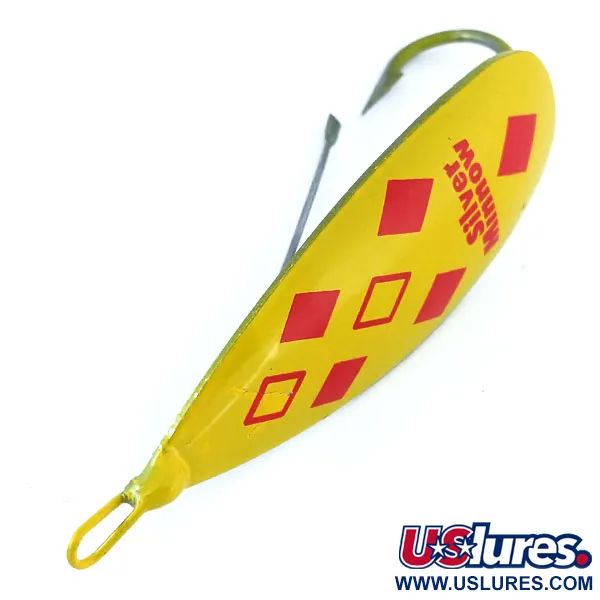 Una vivace finitura gialla con cinque rombi rossi contraddistingue questo esemplare di Weedless Johnson Silver Minnow, catalogato con il codice prodotto 11066. Con una lunghezza di 7 cm (2 3/4") e un peso di 17 g (3/5 oz), questo ondulante è realizzato in una speciale lega di rame e zinco, appositamente progettata con uno spessore maggiore al centro per mantenere l'assetto dell'amo durante il nuoto. Sul retro dell'esca sono chiaramente impressi i marchi «JOHNSON'S SILVER MINNOW» e «MADE IN U.S.A.», che ne certificano l'origine vintage americana. Il design antialga si affida a una robusta protezione metallica che scherma l'amo singolo fisso, consentendo un utilizzo efficace in presenza di fitta vegetazione. Nelle sue condizioni attuali, valutate 5/5, le superfici verniciate e il retro metallico rimangono lucidi e ben definiti. Questo design tecnico permette all'esca di oscillare con un angolo di 270 gradi, generando bagliori distinti, mentre il corpo bilanciato al centro ne garantisce la stabilità senza l'uso di girelle supplementari.