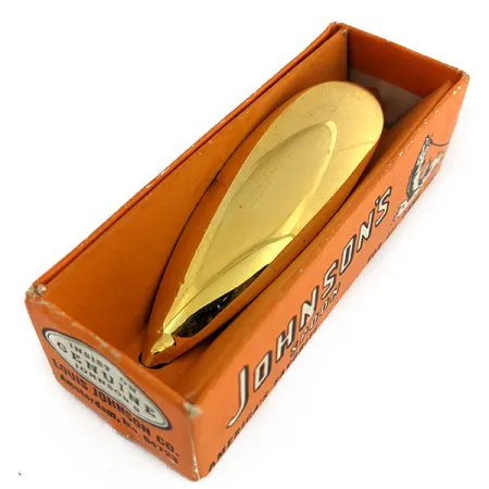 Brillante grazie a una placcatura in oro a 24 carati, questo ondulante da 21 g (3/4 oz) rappresenta un punto di riferimento per i design antialga introdotti per la prima volta da Louis Johnson nel 1920. Lungo 7 cm (2 3/4"), questo specifico esca porta il codice articolo 11648 e viene fornito nella sua scatola di cartone arancione originale. Per un collezionista, trovare questo esemplare vintage prodotto negli USA in condizioni inutilizzate è una vera rarità, poiché la finitura dorata mantiene quella qualità a specchio pensata per richiamare i pesci a distanza. La forma dell'ondulante utilizza una sezione centrale più spessa, una scelta tecnica progettata per mantenere l'assetto dell'amo durante il passaggio tra la fitta vegetazione. Sulla confezione vintage sono incluse le istruzioni originali su come guarnire l'amo protetto con strisce di cotenna di maiale o trailer in plastica per imitare una preda ferita. Questo modello mette in mostra la classica forma a goccia e la protezione antialga che sono diventati un punto fermo nelle cassette da pesca di tutto il continente. L'esterno della scatola offre uno sguardo ai consigli di pesca di metà secolo, sottolineando l'utilità del design negli spazi angusti e tra gli ostacoli.
