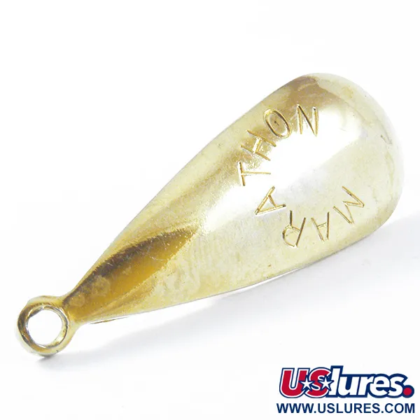 Sul corpo a goccia da 7g (1/4oz) è chiaramente stampato il nome "MARATHON", firma della Marathon Bait Company del Wisconsin, attiva dal 1929 al 1979. Questo Weedless Marathon, identificato dal codice prodotto 3375, sfoggia una finitura in oro lucidato sulla sua struttura da 4,5 cm (1 3/4"). Per navigare tra la fitta vegetazione senza incagliarsi, il design integra un amo singolo protetto da un dispositivo antialga a filo dotato di una piccola perla rosa. Questo esemplare è in condizioni straordinarie, mantenendo la sua lucentezza originale senza segni di usura, meritando una valutazione di 5/5. La struttura presenta un solido occhiello integrato all'estremità stretta, tipico dell'attrezzatura durevole prodotta da Marathon durante i suoi cinquant'anni di storia nel Midwest americano.