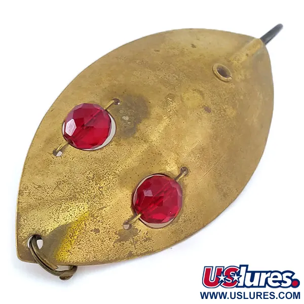 Caratterizzato da una classica finitura in ottone bronzato, questo pesante ondulante pesa 2 1/4 oz (65 g). Questo Weedless Red Eye Muskie di Hofschneider prodotto negli USA, identificato dal codice prodotto 10850, misura una lunghezza sostanziale di 4 3/4" (12 cm). La struttura si concentra su un corpo metallico largo accentuato da due prominenti perle di vetro rosso sfaccettate che riflettono la luce per attirare l'attenzione in acqua. Progettato specificamente per applicazioni antialga, l'esemplare presenta un amo singolo integrato protetto da una guardia metallica per facilitare la pesca attraverso la fitta vegetazione. La superficie metallica mostra un invecchiamento naturale coerente con una valutazione delle condizioni 4/5, mantenendo la sua integrità strutturale e l'estetica distinta. Il suo design è studiato per presentazioni a bassa velocità, consentendo agli occhi di vetro di rimanere visibili ai predatori durante il recupero. Un robusto anello di metallo è fissato all'estremità anteriore per un collegamento sicuro della lenza.