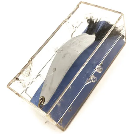 Una nichelatura di qualità definisce l'estetica di questo Weezel Rex Weedless Spoon, un ondulante da lancio da 12,5g (2/5oz) progettato per la pesca in zone con fitta vegetazione. Prodotto dalla Weezel Bait Co. negli USA prima che Eppinger ne rilevasse la produzione, questo esemplare rappresenta un'epoca specifica nella produzione di attrezzatura da pesca. Marchiato direttamente sul metallo, il branding è chiaro e nitido. Lungo 5,5cm (2 1/4"), l'ondulante presenta un robusto dispositivo antialga in filo metallico per proteggere la punta dell'amo. Piume nere adornano la coda, fornendo un profilo visivo distinto che completa la finitura in nichel lucido. Il codice prodotto 11646 identifica questo articolo inutilizzato, conservato nella sua scatola espositiva originale trasparente con fondo blu vintage. Il metallo e la minuteria non mostrano segni di invecchiamento o usura.