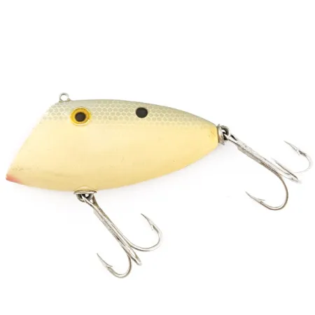 La finitura color crema chiaro su questo corpo classico da 6,5 cm (2 1/2") sfuma in un sottile motivo a scaglie a rete lungo la cresta dorsale. Con un peso di 14 g (1/2 oz), questo Whopper Stopper Bayou Boogie (Codice Prodotto 23278) presenta il caratteristico mento con punta rossa, un classico segnale visivo per molte esche lipless di produzione americana. Gli occhi gialli dipinti a mano con grandi pupille nere offrono un punto focale ad alto contrasto, completato da una singola macchia scura posizionata sul fianco verso la coda. Prodotto negli USA, questo esemplare ha una valutazione di conservazione di 4/5, mostrando lievi segni del tempo mentre la componentistica rimane intatta. Due ancorette in stile originale sono montate tramite robusti occhielli sulla pancia e sulla coda, rendendolo un'aggiunta preziosa a una collezione di esche d'epoca.