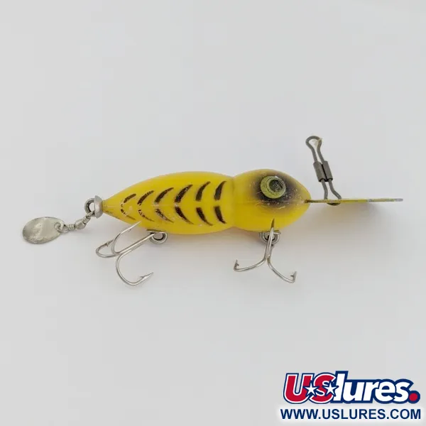 Il peso di 7 g conferisce a questo Hellbender una grande versatilità sia per il casting che per il trolling. Decorato nella classica livrea Tiger, il corpo giallo presenta audaci striature nere lungo i fianchi e una zona della testa oscurata. Una sporgente paletta in metallo è progettata per portare l'esca a profondità di 2 metri. Nella parte posteriore, una piccola paletta argentata a foglia di salice è fissata tramite una girella per aggiungere ulteriore flash durante il recupero. Questo modello da 5,5 cm riporta il codice prodotto 24503. Due ancorette sono fissate al corpo con la tradizionale ferramenta a vite. Grandi occhi dipinti con iridi verdi e nere forniscono un distinto fuoco visivo. Valutata 4/5, l'esterno mostra minimi segni di usura e mantiene il suo carattere originale.