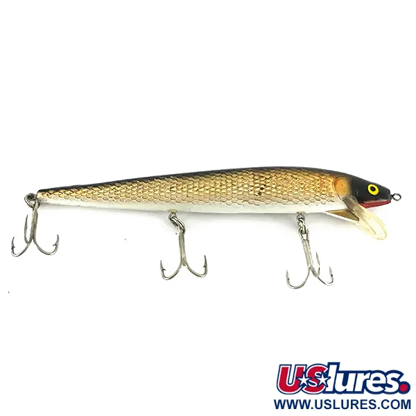 Motivi a scaglie dorate avvolgono il corpo da 14 cm (5 1/2") di questo Whopper Stopper Hellcat vintage, catalogato con il codice prodotto 7744. Con un peso di 10 g (1/3 oz), l'artificiale presenta una testa scura che sfuma nettamente nel corpo dorato riflettente, accentuato da occhi gialli con bordo rosso. Prodotto negli USA, questo modello utilizza una configurazione a tre ancorette tipica dei minnow più lunghi per il casting o la traina. La paletta trasparente è fissata direttamente nel muso dell'esca, sotto l'occhiello di aggancio. Questo esemplare è in condizioni 5/5, con finitura e componenti metalliche ben conservate.
