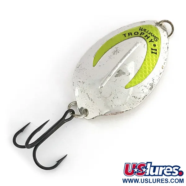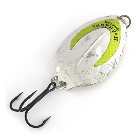 L'autentica argentatura conferisce una qualità riflettente unica a questo ondulante da 21g (3/4oz), una finitura scelta dal produttore canadese per la sua superiore lucentezza in acque profonde o torbide. Lungo 6,5cm (2 1/2"), il Williams Trophy (Codice Prodotto 8277) presenta un caratteristico inserto chartreuse a forma di U che funge da punto d'attacco ad alta visibilità. In condizioni di scarsa illuminazione, questo inserto verniciato reagisce con una distinta luminescenza, completando la lucentezza naturale del corpo argentato. La superficie mostra lievi segni di utilizzo, mantenendo una valutazione di condizione 4/5 che ne riflette la storia pur rimanendo pienamente funzionale. Un robusto anello spaccato assicura un amo triplo nero, progettato per lo spinning o la traina a grandi predatori come la trota di lago e il luccio. Questo esemplare rappresenta gli standard di design classici sviluppati dai fratelli Williams, pionieri nell'uso della placcatura in metalli preziosi nella produzione di attrezzatura da pesca all'inizio del 1900.