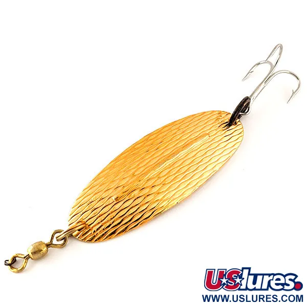 Con un peso di 21 g (3/4 oz), questo classico canadese presenta una sorprendente finitura in oro martellato che offre un profilo testurizzato distintivo. Il corpo da 8,2 cm (3 1/4") del Williams Wabler W60, codice prodotto 12379, è costruito attorno a una nervatura longitudinale brevettata, progettata per la stabilità durante il recupero. Williams placcano tradizionalmente queste esche con metalli preziosi e la superficie riflettente di questo esemplare rimane brillante e pulita. Un'ancoretta robusta è collegata tramite un anello spaccato scuro in coda, mentre la testa è dotata di una girella in ottone per agevolare la gestione del filo durante il lancio o la traina a lucci e sandre. La trama martellata è progettata specificamente per catturare e riflettere la luce da più angolazioni mentre è immersa.