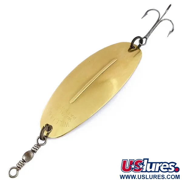Una caratteristica nervatura longitudinale definisce il profilo di questo ondulante da 10 cm (4") con finitura dorata. Questo Williams Wabler W70, identificato dal codice prodotto 10713, mette in mostra l'artigianato iniziato a Buffalo nel 1914 prima che la produzione si spostasse in Canada. Con un peso di 28 g (1 oz), la struttura pesante è placcata in una ricca tonalità oro, mantenendo una valutazione di 5/5 con una superficie brillante e pulita. Il marchio stampato sulla faccia rimane nitido e leggibile, a testimonianza della sua produzione di qualità. Questo modello è progettato per mantenere la stabilità sia durante il recupero veloce che lento, un risultato tecnico ottenuto grazie alla sua esclusiva nervatura strutturale. Viene fornito equipaggiato con una grande ancoretta e una girella, destinato alla pesca di grandi lucci o lucioperca. Dal 1978, queste esche sono prodotte esclusivamente in Canada e questo esemplare rappresenta la lunga tradizione di eccellenza nella lavorazione del metallo. La finitura dorata offre un'alta visibilità in varie condizioni d'acqua e rimane in condizioni immacolate.
