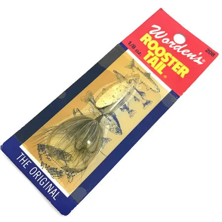 Le lucenti pale a foglia di salice dorate offrono il tipico bagliore di questo classico spinner Yakima Bait, un design che è rimasto un punto fermo per gli appassionati di trote e persici per decenni. Con un peso di 1/8oz (3,6g) e una lunghezza di 2 1/4" (5,5cm), questo esemplare è ideale per lo spinning leggero in torrenti o laghetti. Identificato dal codice prodotto 6746, l'esca presenta una coda piumata color sabbia naturale ed è inutilizzata, apparendo proprio come quando ha lasciato la linea di assemblaggio in Messico. La confezione originale, contrassegnata dal classico banner blu 'The Original' e dal marchio Worden's, è intatta. Questa configurazione rimane uno dei design di spinner in-line più riconosciuti, particolarmente apprezzato dai collezionisti che amano la semplicità e l'efficacia della combinazione oro e piume.
