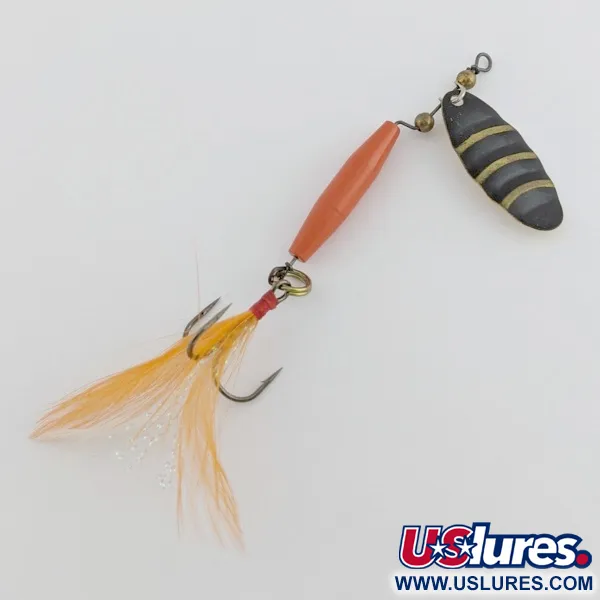 Un vivace corpo a forma di sigaro arancione-rosso ancora questo classico cucchiaino rotante in-line, riflettendo l'eccellenza manifatturiera della Worth Company con sede a Stevens Point, Wisconsin. Poiché Worth è leggendaria per la fornitura di componenti di alta gamma come anelli spaccati e girelle all'intera industria della pesca, un'esca finita come questo #301, identificato dal codice prodotto 24436, mette in mostra il loro hardware di precisione in un pacchetto completo. La paletta a forma di goccia presenta una suggestiva faccia nera con strisce festonate dorate, mentre il retro rivela una trama in oro martellato. Questo esemplare, valutato con condizione 5/5, include un'ancoretta piumata con piume arancioni e gialle fissate da un pulito avvolgimento di filo rosso. L'assemblaggio utilizza piccole perline di ottone e un cavalierino specializzato per facilitare una rotazione fluida durante un recupero costante in ambienti d'acqua dolce per trote o persici. È un solido esempio di artigianato americano della metà del secolo proveniente dal cuore del Midwest.