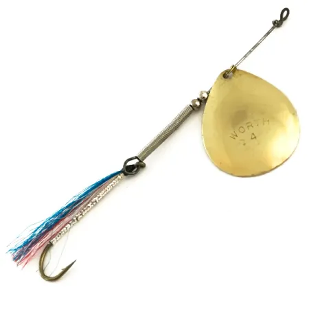 Chiaramente impresso sulla pala color ottone si trova il marchio "WORTH 4", che identifica questo classico cucchiaino rotante di produzione americana. Worth, azienda sinonimo di componentistica per la pesca di qualità, ha prodotto questo modello 6285 con una pala a goccia che ruota su un robusto asse metallico. Con una lunghezza di 10 cm (4") e un peso di 3,5 g (1/8 oz), l'esca presenta un corpo costruito con una distintiva molla metallica a spirale e una coppia di piccole perline distanziatrici. La finitura in ottone della pala fornisce una superficie brillante e riflettente che contrasta con il dressing legato a mano sull'amo singolo caudale. Questo dressing è composto da filamenti di tinsel blu, bianchi e rosso-rosati fissati da un filo nero. Nel suo stato attuale, l'esca mantiene una valutazione di 5/5, con l'asse e l'amo perfettamente dritti e la struttura metallica che mostra una notevole lucentezza.