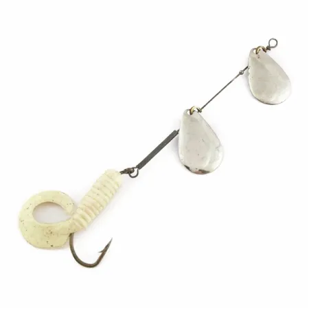 Due palette nichelate a goccia caratterizzano l'assemblaggio superiore di questo rotante inline, fornendo lampi costanti durante un recupero regolare. Con una lunghezza totale di 13 cm (5") e un peso di 5 g (3/16 oz), questo assetto è ideale per il casting leggero o la traina in acque dolci. La finitura in nichel delle palette si abbina a un grub bianco a coda riccia con sottili glitter argentati per una maggiore attrazione visiva. Perline rosse di attrazione sono posizionate sull'armatura in acciaio per distanziare correttamente le palette e fornire un punto focale vicino ai cavalieri. Un amo singolo è innescato con la coda in plastica morbida lamellata, fissata al telaio tramite un robusto occhiello metallico. Il produttore Worth ha realizzato questi componenti con un semplice occhiello in testa per l'attacco diretto della lenza o l'uso di un piccolo moschettone. Le condizioni generali sono valutate 5/5, con superfici metalliche pulite e un trailer in plastica morbida. Catalogata con il codice prodotto 24502, questa specifica configurazione evidenzia la natura modulare dei design dei cucchiaini rotanti vintage.