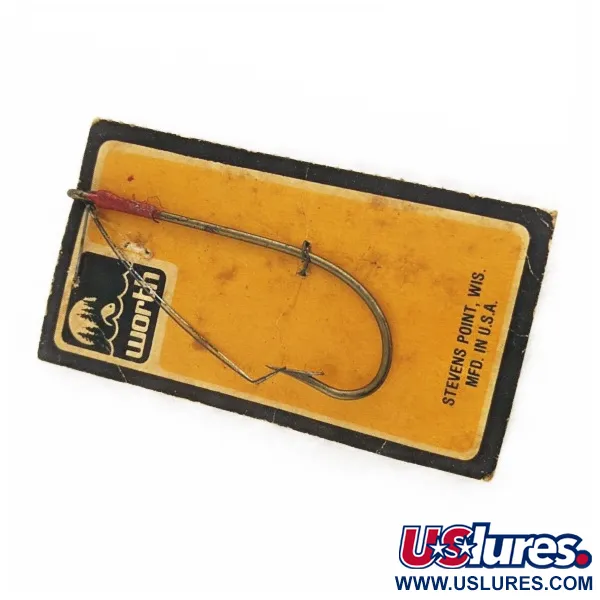 La nichelatura conferisce una finitura pulita e brillante a questo amo antialga, progettato per pescare in mezzo a una fitta vegetazione. Una singola guardia in filo metallico è fissata accuratamente all'occhiello con un filo rosso avvolto a mano, assicurando che la punta rimanga libera da incagli. Worth ha prodotto questo articolo, identificato dal codice prodotto 24486, presso lo stabilimento di Stevens Point, Wisconsin. Ancora fissato al cartoncino originale nero e giallo, l'amo è in condizioni inutilizzate con una valutazione di 6. La grafica sulla confezione mostra il vecchio logo con elementi stilizzati di montagna e acqua tipici del branding iniziale del produttore.