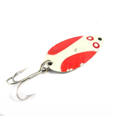 Lungo 1 1/2" (3,5 cm), la faccia verniciata di questo ondulante presenta un caratteristico motivo bianco e rosso, arricchito da dettagli a scaglie e occhi circolari rossi vicino alla testa. Il Wright & McGill Pay-Master, identificato dal codice 0941, è un classico delle cassette da pesca americane di metà secolo. Girando l'esca si scopre una finitura in nichel lucidato dove il nome del marchio e il peso di 1/4 oz (7 g) sono impressi profondamente nel metallo. Nelle sue condizioni 4/5, la vernice rimane vivace e la minuteria, inclusi l'ancoretta e l'anellino spaccato, è ben conservata. La struttura dell'esca è centrata su un corpo metallico a forma di goccia che fornisce il peso necessario per il lancio. Ogni dettaglio, dalla stampigliatura chiara sul retro alla specifica applicazione della vernice, riflette gli standard di produzione un tempo comuni negli USA. Il punto di attacco sulla testa è forato con precisione, destinato ad anellini spaccati o moschettoni standard.