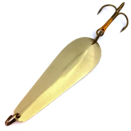 I toni dell'ottone catturano la luce lungo il corpo slanciato e allungato di questo ondulante da 11g (2/5oz). Stampato chiaramente sulla superficie concava interna, il marchio Wright & McGill identifica questo modello come un vero Streamliner, un esempio classico dell'attrezzatura americana di metà secolo. Con una lunghezza di 6 cm (2 1/4"), l'ondulante presenta uno spessore notevole pensato per i lanci a lunga distanza. Questo esemplare, identificato dal codice 10364, è equipaggiato con componenti originali, inclusi un'ancoretta bronzata e anellini spaccati sicuri. La finitura metallica è eccezionalmente ben conservata sulla lama affusolata, meritando una valutazione di 5/5. Ogni curva riflette gli standard produttivi degli USA, dalla nitida scritta del brand alla forma uniforme del metallo.