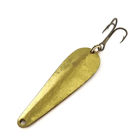 Sulla parte posteriore, l'ottone riporta chiaramente il nome WRIGHT & McGILL insieme alla designazione del modello e al peso. Con un peso di 7 g (1/4 oz), questo classico ondulante in metallo misura 4,5 cm (1 3/4") di lunghezza e presenta un profilo a goccia ideale per lo spinning o la traina. L'esca è realizzata in ottone, con una tonalità dorata calda su tutta la superficie. È dotata di un'ancoretta fissata tramite un anellino spaccato in coda, mentre la testa presenta un foro per il fissaggio della lenza. Con una valutazione di 5/5, l'esemplare mostra leggeri segni superficiali e graffi coerenti con la sua età. Sul lato inferiore, la stampigliatura STREAMLINER - 1/4 OZ rimane nitida e leggibile, a conferma delle sue origini americane con il codice prodotto 11496.