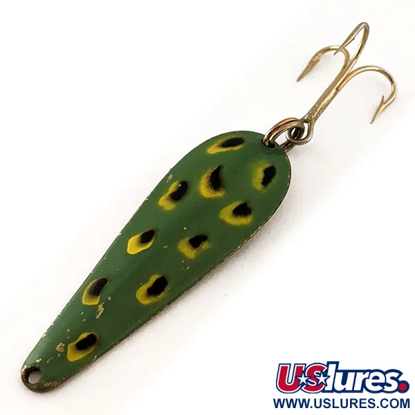 Realizzato con una struttura in ottone, questo ondulante a goccia misura 4,5 cm (1 3/4"). Le diciture Wright & McGill e Streamliner sono incise direttamente sul retro in metallo e risultano nitide e leggibili, identificando questo specifico esemplare con il codice prodotto 11704. La parte anteriore presenta la tradizionale finitura Frog, caratterizzata da una base verde oliva scuro decorata con macchie nere bordate di giallo che imitano le prede naturali. Con un peso di 7 g (1/4 oz), l'esca è armata con un'ancoretta dorata fissata tramite un anello spaccato all'estremità più larga del corpo. Questo pezzo da pesca prodotto negli USA mostra un grado di conservazione 5/5, con la vernice smaltata che mantiene la sua brillantezza originale e il retro in ottone che appare pulito e lucido. La sagoma del metallo che si restringe verso l'occhiello di attacco suggerisce un design ideale per il lancio o la traina in varie condizioni di acqua dolce.