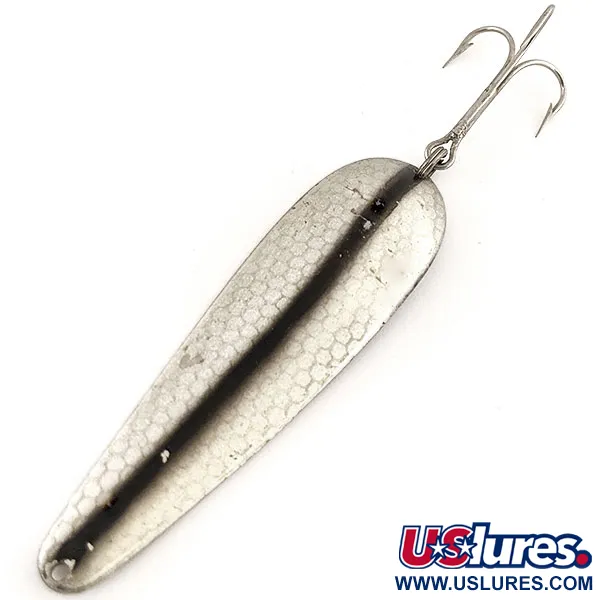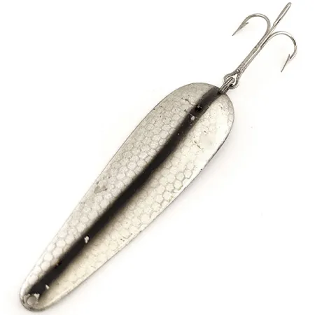 Punzonato con il marchio 'Wright & McGill' e 'Streamliner - 5/8 OZ' sul retro, questo classico ondulante proviene dal rinomato produttore di Denver. La superficie superiore mostra un motivo a scaglie grigie testurizzato, un fine design esagonale a nido d'ape su una base in nichel lucido con una marcata linea dorsale scura. Identificato dal codice prodotto 13030, l'esca è lunga 3" (7,5 cm) e ha un peso di 2/3 oz (18 g). Le condizioni sono eccellenti (4/5), con una finitura ben conservata e una punzonatura nitida. Un grande amo triplo è montato sul retro tramite un robusto anello metallico. Progettato per lo spinning o la traina, il corpo in metallo pesante mantiene il suo profilo durante il recupero. Un foro di precisione sulla punta affusolata funge da punto di attacco per la lenza.