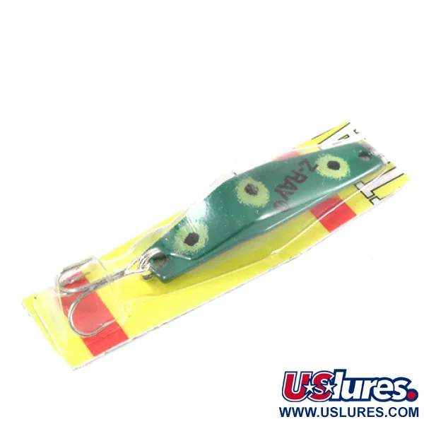 Una colorazione verde scuro funge da base per lo Z-Ray Model 120, con distinti aloni giallo-verdi e centri neri che formano il suo schema Rana. Questo ondulante da 1/4 oz (7 g) è prodotto negli USA da Z-RAY Lures e misura 2" (5 cm) di lunghezza. Identificato dal codice prodotto 2561, l'artificiale è inutilizzato e rimane nella sua confezione blister trasparente originale. Il corpo metallico reca un marchio Z-RAY ben definito ed è armato con un'ancoretta standard. Il cartoncino posteriore è ben conservato, mostrando le classiche grafiche rosse e gialle insieme al codice a barre e ai dettagli del prodotto.