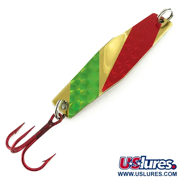 Un dettaglio tricolore definisce il lato frontale di questo ondulante prodotto negli USA, caratterizzato da una base dorata lucida impreziosita da un nastro prismatico a scaglie rosso e verde vibrante. Con un peso di 2/5 oz (11 g), il Z-Ray Model 125 è un artificiale da 2 1/2" (6,5 cm) di Z-RAY Lures, identificato dal codice prodotto 7031. Il lato anteriore mostra motivi geometrici all'interno delle sezioni colorate che catturano efficacemente la luce, mentre il retro rimane di un oro pulito e uniforme. La dotazione include un robusto anellino spaccato sull'occhiello e un distintivo amo triplo con finitura rossa, che aggiunge un netto contrasto visivo al corpo metallico. Questo esemplare è in condizioni eccellenti, valutato 5/5, mostrando la lucentezza originale della placcatura in oro e l'integrità delle strisce prismatiche adesive. Costruito per durare, è progettato per lo spinning o la traina.